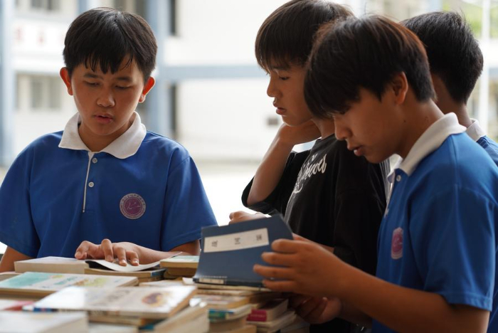 保山市隆陽區(qū)潞江鎮(zhèn)民族中學(xué)的學(xué)生們?cè)谛侣涑傻膱D書館參觀(6月21日攝)。新華社發(fā)