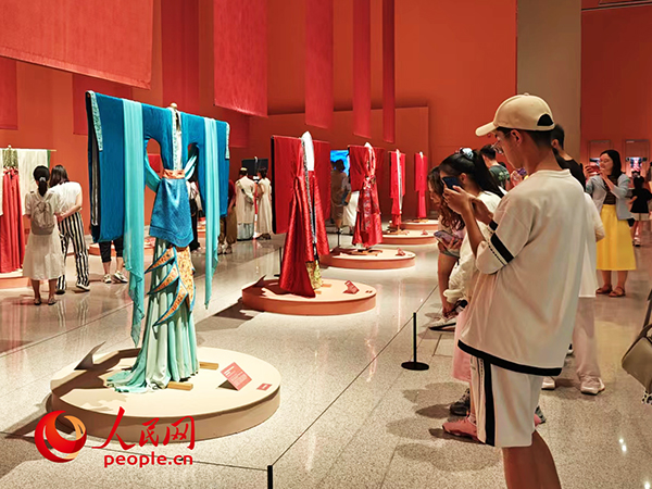 7月20日,正值周末,中國工藝美術(shù)館(中國非物質(zhì)文化遺產(chǎn)館)“五彩錦簇——中華服飾文化展”的展廳里人流如織。有人舉起手機(jī)拍照留念,有人駐足了解精湛的織造工藝,還有人在與同伴討論哪里能買到“同款”衣裝……這場(chǎng)中華服飾的視覺盛宴,讓眾多游客沉浸其中。