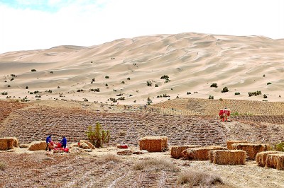 近年來,莫高窟已經(jīng)逐漸形成風沙危害綜合防護體系,有效減輕了風沙對石窟的影響。圖為7月23日,在莫高窟的崖頂上,工作人員正在鋪設(shè)草方格固沙。