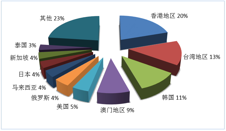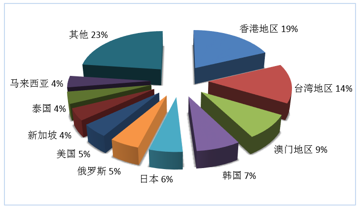 第三季度旅行社入境旅游接待人次排名前十位的客源地國(guó)家或地區(qū)由高到低依次為香港地區(qū)、臺(tái)灣地區(qū)、韓國(guó)、澳門地區(qū)、美國(guó)、俄羅斯、馬來西亞、日本、新加坡、泰國(guó)(見圖2)。