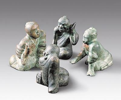 20世紀(jì)90年代甘肅靈臺縣出土了一組西漢銅質(zhì)博戲俑。俑最高9.2厘米,最寬9.7厘米。四俑相向跪坐,身著高領(lǐng)長服。其中二人頭挽發(fā)髻,二人以寬巾裹頭。坐姿不同,形態(tài)各異,有的前傾仰首,有的垂臂塌肩;有的袒胸露膊,似在伸手探??;有的屈腿斜身,默然扶膝靜坐。四俑的面部表情不同,刻畫細(xì)膩。他們或喜笑顏開,或嚴(yán)肅面對,或凝神沉思,或略顯悲愁,神態(tài)活現(xiàn),精彩逼真,具有高超的藝術(shù)性和研究價值。
