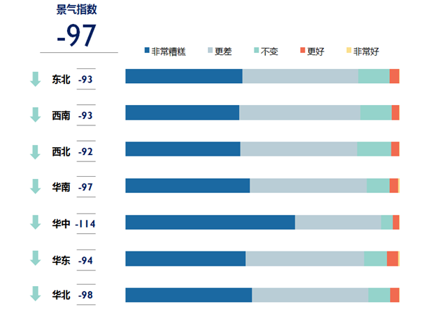 《報告》稱,受疫情影響,全國各地對于旅游到訪目的地的景氣預期同樣極度消極,7大地區(qū)市場的平均景氣指數跌至-97。其中,受疫情影響最為嚴重的華中地區(qū)景氣指數最低。同樣的,目的地景氣指數也表現(xiàn)出疫情影響越嚴重,指數表現(xiàn)越低的趨勢。