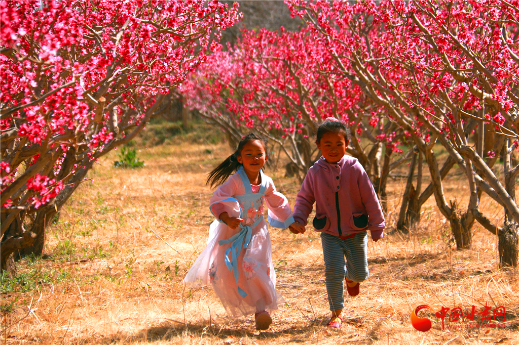 2020年4月22日,一名身著古裝的小朋友在甘肅省敦煌市七里鎮(zhèn)杜家墩村的桃園中游玩。