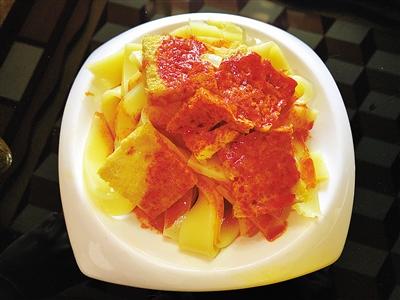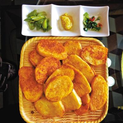 炕鍋洋芋是臨夏農(nóng)家樂里面常見的一道特色小吃,在臨夏,煎、烙之類的烹飪方式都被稱作炕,炕鍋洋芋因此得名。洋芋切片后,直接放熱油中兩面煎透。炕鍋洋芋的做法雖不復雜,但其對于火候的要求卻極其嚴苛,多一分會焦,少一分則不熟。