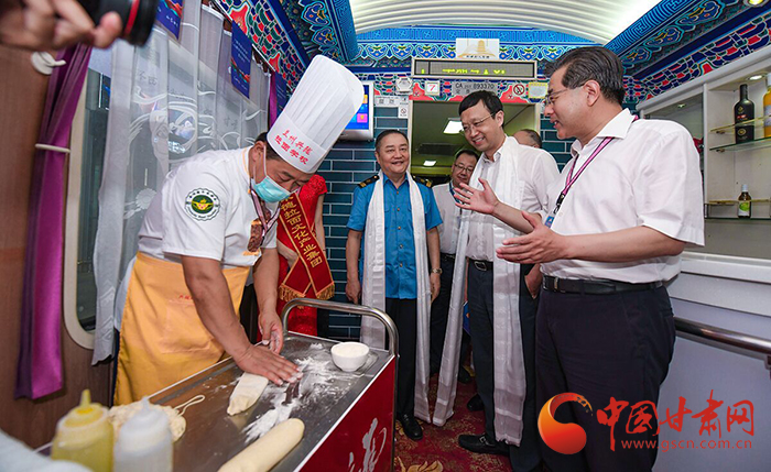 這艘“陸上郵輪”就像流動的甘肅文旅“博物館”“展覽廳”“宣傳隊”,組織全省14市州和蘭州新區(qū)文旅部門、文旅企業(yè)、媒體記者、文藝演出團隊200多人參加,集合了“吃、住、行、游、購、娛”和“商、養(yǎng)、學(xué)、閑、情、奇”等文旅全要素,用凸顯甘肅文化旅游特質(zhì)的元素包裝設(shè)計車體,將富含各市州地域特色的文創(chuàng)商品、非遺產(chǎn)品、農(nóng)特扶貧產(chǎn)品濃縮裝載到每一節(jié)車廂,并以直播帶貨的形式進行現(xiàn)場“圈粉”,直觀形象、全面精致地展現(xiàn)了甘肅文化旅游獨一無二的特色品質(zhì)。“飛天”歌舞、裕固族和白馬藏族俊男靚女的歌喉,更是深情演繹了甘肅文化的厚重、風(fēng)物的絢爛、人民的熱情,盛邀八方賓客了解甘肅、愛上甘肅、投資甘肅。