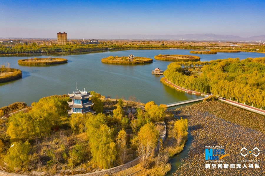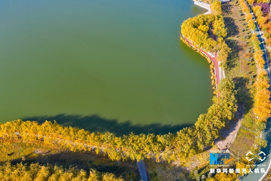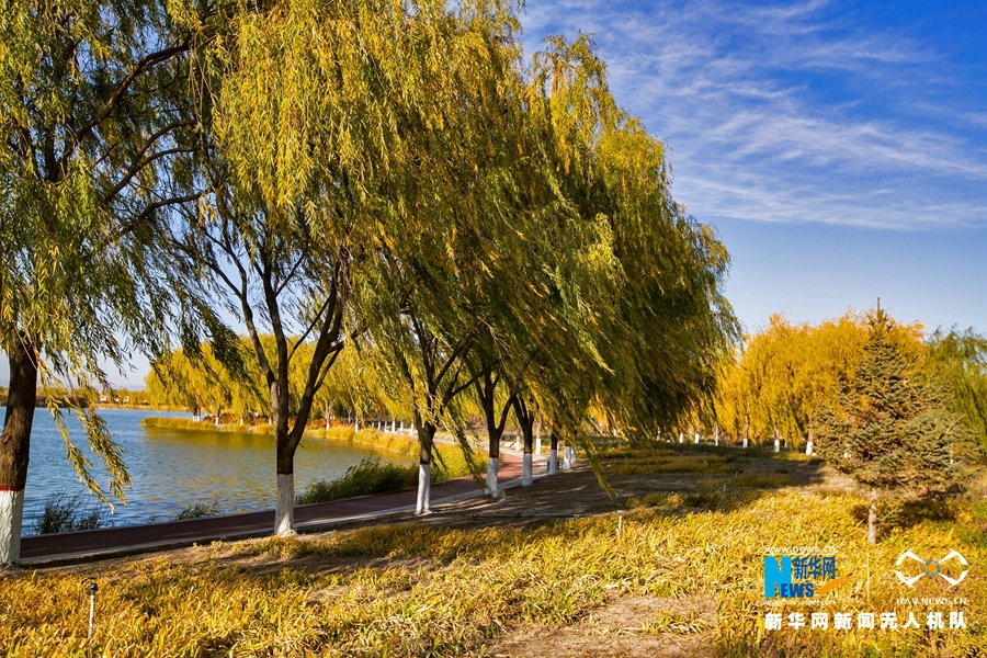 深秋時(shí)節(jié),國(guó)家4A級(jí)景區(qū)甘肅省張掖潤(rùn)泉湖公園秋水依依,草木金黃,呈現(xiàn)出一幅斑斕畫卷。新華網(wǎng)發(fā)(成林 攝)