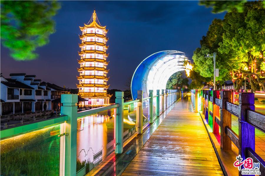 周莊大橋下,圓月與云海塔交相輝映;全福長橋橫臥于南湖上,高懸于空的圓月獨(dú)擁蒼穹。共賞圓月,再現(xiàn)“春江花月夜”之景。