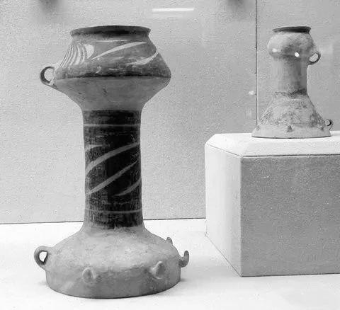細細考究這些器物,彩陶鼓由喇叭形大頭和呈罐口、盤口造形的小頭,長形圓筒狀的中腔三部分組成,前后貫通。而在靠近喇叭口外沿,卻分布著6-12個鷹爪狀泥突。顯然,它們是為了掛住某些東西。
