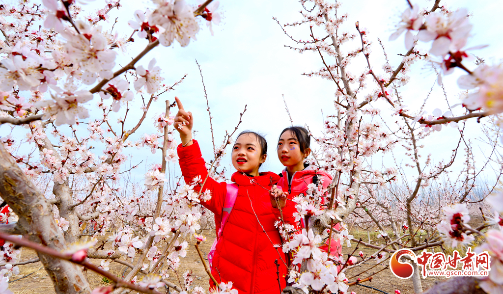 4月3日,小朋友在甘肅張掖甘州區(qū)金滿園千畝杏園種植基地杏花園里跳起了《春之舞》。