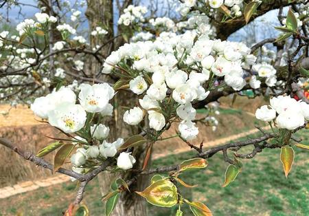 一樹(shù)樹(shù)、一朵朵雪白的梨花迎風(fēng)搖曳,散發(fā)出陣陣清香。