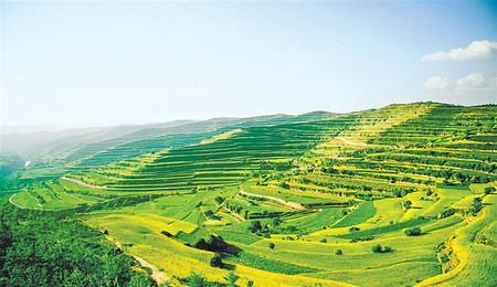 夏日時節(jié)的莊浪縣,滿眼盡是綠色。站在高處遠(yuǎn)眺,層層梯田依山勢錯落分布,好似黃土高原上泛起的彩色波浪。