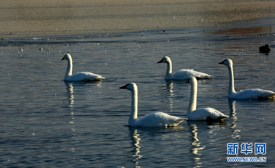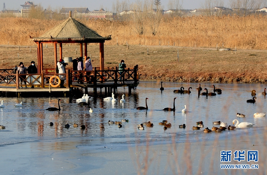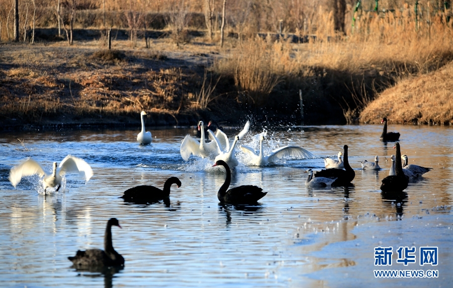 冬日清晨的甘肅省張掖國家濕地公園里碧波蕩漾,成群的白天鵝、黑天鵝等鳥類聚在一起游弋嬉戲,歡騰跳躍,成為一道亮麗的風景線,吸引眾多游客觀賞拍照。新華網(wǎng)發(fā)(陳禮 攝)