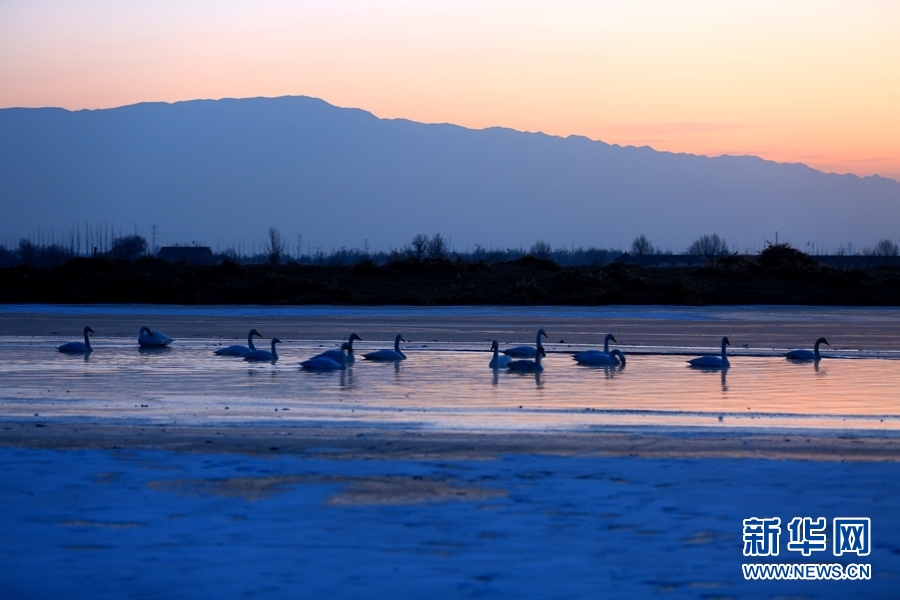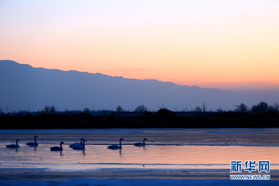 2022年1月2日,晨曦初露的甘肅省張掖市甘州區(qū)黑河流域,一群大天鵝在河中棲息、覓食,宛如一幅靜美的畫(huà)卷。新華網(wǎng)發(fā)(楊永偉 攝)