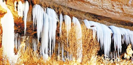 小路隨著山勢,曲折延伸。對面荒坡上隨處可見大大小小的洞穴,不知是經(jīng)年風(fēng)蝕,還是人工開采沙子所致。洞穴四周,散落著小小的冰瀑,有的似乎只有盈盈一握。長長短短的冰掛,一綹一綹,一排一排,遠遠近近錯落有致地覆在山坳里,垂在砂石間,掛在懸崖上。一些細細長長的冰溜,像極了臘月里母親剛出鍋的粉條。搭在院子竹竿上的一掛粉條,下邊還垂著水珠,上邊早已凍成了細細的冰棒,而滴落在地上的水已凝成了冰堆。