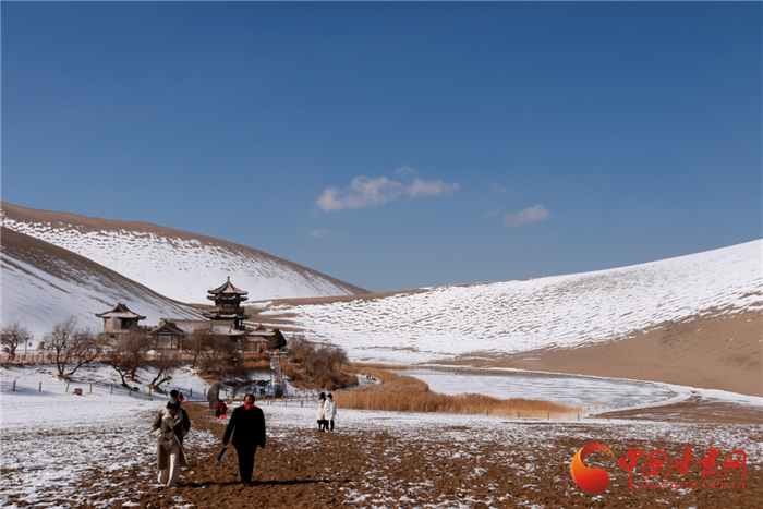 雪后的甘肅省敦煌市鳴沙山月牙泉景區(qū)景色如畫、銀裝素裹,美不勝收。