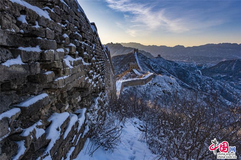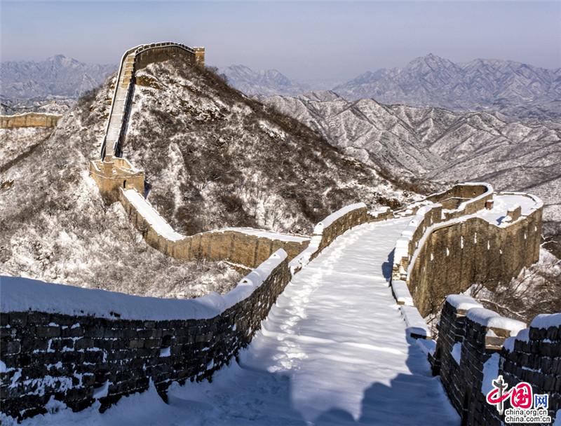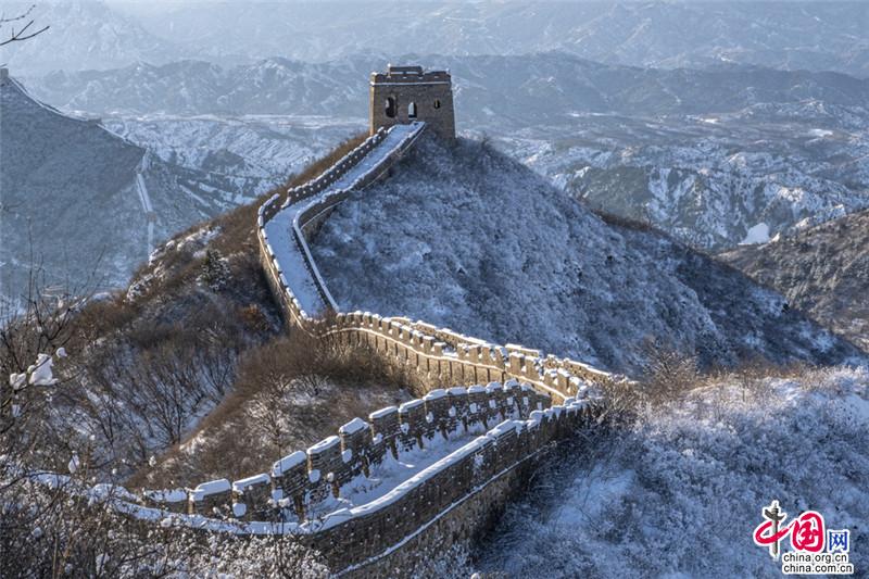 皚皚白雪覆蓋長城內(nèi)外,銀裝素裹金山嶺氣勢磅礴。