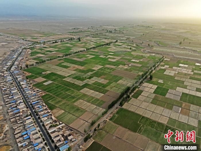 圖為航拍鏡頭下的戈壁田園?!∴嵰?nbsp;攝