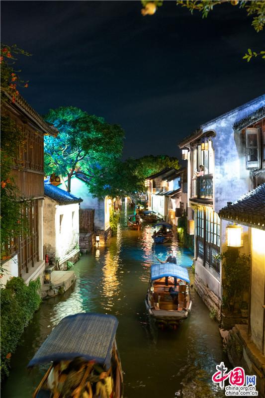 宋朝時候,宵禁解除,每至深夜,燈火通明。如今周莊的夜色,亦是在光影中沉醉,水影搖曳間,畫船枕眠。這里,可以陽春白雪,不食煙火;也可以徹夜不歇,最懂人間。這場周莊的溫柔夢,將一直編織下去……澤國溫柔的清風(fēng),夜間可愛的彎月,若能與你共賞,那便再無遺憾。歌里唱,不懼怕,天涯路長,甘為你,披滿身風(fēng)霜,請君,入夢。(尤紫璇 周宣)