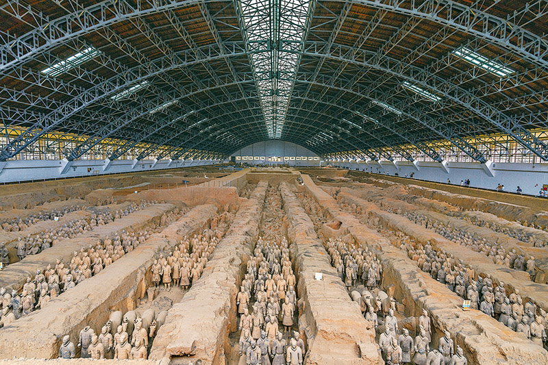秦始皇陵是中國歷史上第一個多民族的中央集權(quán)國家的皇帝秦始皇于公元前246年至公元前208年營建的。作為秦始皇陵陪葬墓坑之一的兵馬俑坑于1974年被發(fā)現(xiàn),被譽為“世界第八大奇跡”。圖為秦始皇兵馬俑博物館一號坑全景?!∪嗣駡D片 丁俊豪/攝