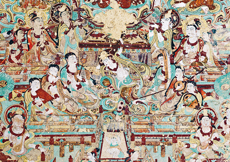 敦煌文化延續(xù)近兩千年,是世界現(xiàn)存規(guī)模最大、延續(xù)時間最長、內(nèi)容最豐富、保存最完整的藝術(shù)寶庫,是世界文明長河中的一顆璀璨明珠,也是研究我國古代各民族政治、經(jīng)濟、軍事、文化、藝術(shù)的珍貴史料。圖為莫高窟第112窟南壁壁畫“反彈琵琶樂舞圖”?!《鼗脱芯吭汗﹫D