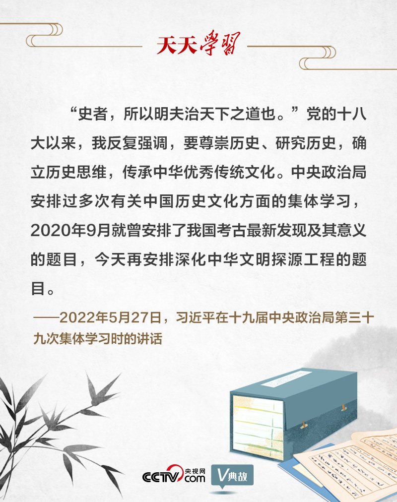 為深入了解中華文明五千多年發(fā)展史,推動(dòng)把中國文明歷史研究引向深入,推動(dòng)全黨全社會(huì)增強(qiáng)歷史自覺、堅(jiān)定文化自信,2022年5月27日,十九屆中央政治局就深化中華文明探源工程進(jìn)行第三十九次集體學(xué)習(xí)。習(xí)近平總書記引用古語“史者,所以明夫治天下之道也”,強(qiáng)調(diào)要尊崇歷史、研究歷史,確立歷史思維,傳承中華優(yōu)秀傳統(tǒng)文化。