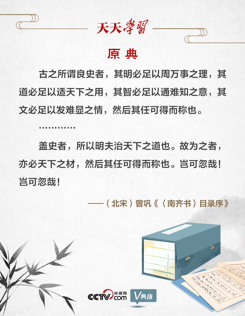 《〈南齊書〉目錄序》是曾鞏為“二十四史”之一的《南齊書》所寫的一篇序文,體現(xiàn)了曾鞏的史學(xué)研究價(jià)值取向。文章圍繞著“良史(優(yōu)秀的史官)”二字展開。曾鞏認(rèn)為,“古之所謂良史者,其明必足以周萬事之理,其道必足以適天下之用,其智必足以通難知之意,其文必足以發(fā)難顯之情”。曾鞏在唐代史學(xué)家劉知幾“史才三長(才、學(xué)、識)”基礎(chǔ)上,將“良史”的標(biāo)準(zhǔn)引申為四點(diǎn):明、道、智、文。其中,文、明、智相當(dāng)于才、學(xué)、識,而“道”則是曾鞏的發(fā)展,并被擺在核心位置。曾鞏指出,“蓋史者,所以明夫治天下之道也。故為之者,亦必天下之材”。曾鞏認(rèn)為,史書要闡明治國安邦的法則和規(guī)律,因此史家必須是兼具明、道、智、文的“天下之材”。他提出史家要發(fā)揮史學(xué)經(jīng)世致用的作用,修史要總結(jié)前朝興亡的經(jīng)驗(yàn)教訓(xùn),為后世提供“法戒”。