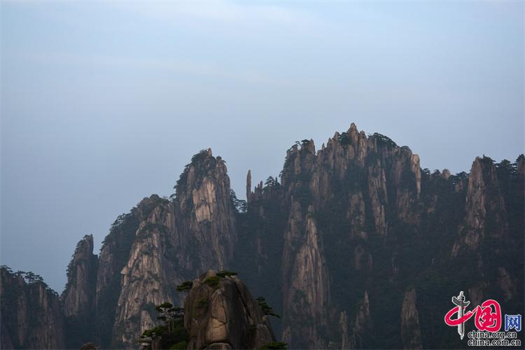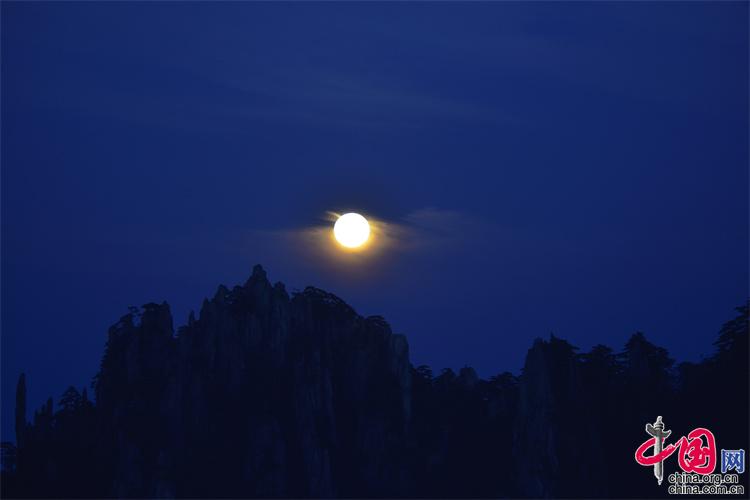 9月10日,中秋之夜,7點左右月亮如約而至,躍出地平線,穿過群峰峻嶺,露出了它靚麗的臉龐。剛出的時候,月亮和初升的太一樣是帶紅色的,隨著慢慢的升起越來越明亮,這時的黃山在月光照射下變得很清新。(姚育青)