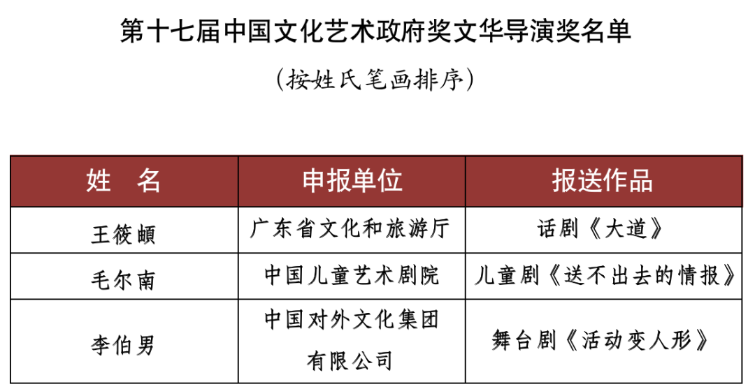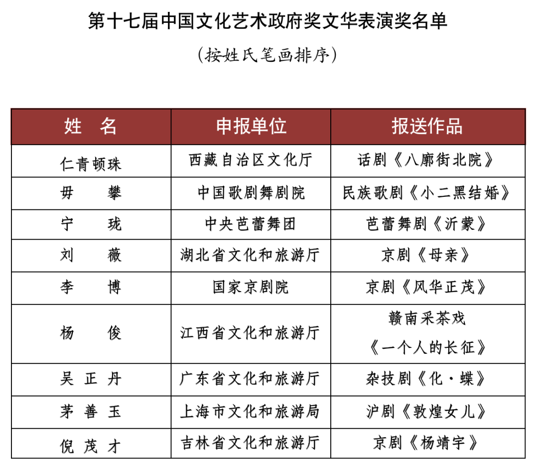 9月15日,文化和旅游部對(duì)外公布了《第十七屆文華獎(jiǎng)獲獎(jiǎng)名單》。舞劇《五星出東方》(北京市文化和旅游局選送)、話劇《塞罕長歌》(河北省文化和旅游廳選送)、舞蹈詩劇《只此青綠》--舞繪《千里江山圖》(中國東方演藝集團(tuán)有限公司選送)等15個(gè)作品獲得第十七屆中國文化藝術(shù)政府獎(jiǎng)文華大獎(jiǎng)。