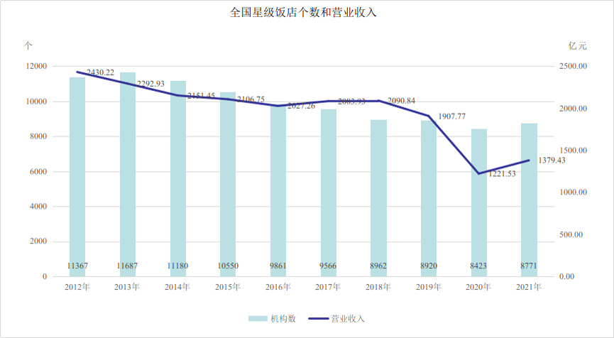 數(shù)據(jù)顯示,截至2021年,全國(guó)星級(jí)飯店總數(shù)達(dá)到8771個(gè),營(yíng)業(yè)收入達(dá)到1379.43億元。