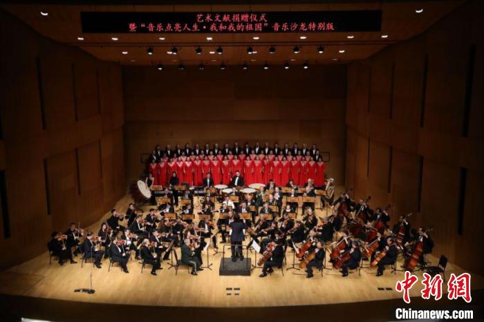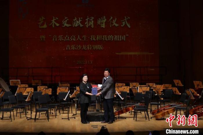 國(guó)家圖書館重要藝術(shù)文獻(xiàn)捐贈(zèng)儀式暨“音樂點(diǎn)亮人生·我和我的祖國(guó)——音樂沙龍?zhí)貏e版”活動(dòng)3日晚在國(guó)圖藝術(shù)中心·音樂廳舉辦。國(guó)家圖書館黨委書記、副館長(zhǎng)魏大威接受捐贈(zèng),并為捐贈(zèng)人代表中央民族歌舞團(tuán)民樂團(tuán)團(tuán)長(zhǎng)馬蘭花頒發(fā)捐贈(zèng)證書。