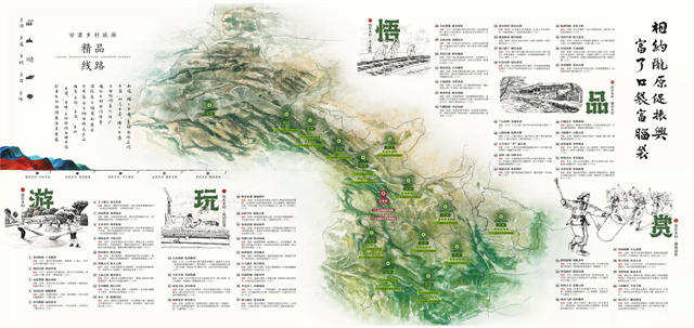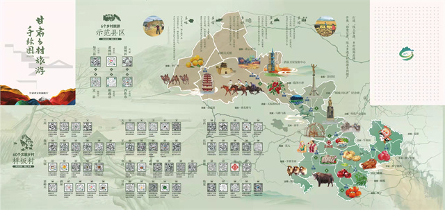 據(jù)介紹,手繪圖以“相約隴原促振興·富了口袋富腦袋”為主題,突出“圖文并茂、服務(wù)游客、便于攜帶、適于珍藏”等特點(diǎn),對(duì)2022年創(chuàng)建的6個(gè)鄉(xiāng)村旅游示范縣,60個(gè)文旅振興鄉(xiāng)村樣板村全部開(kāi)發(fā)設(shè)計(jì)了電子“二維碼”,設(shè)置了甘肅省鄉(xiāng)村旅游60條四季精品線路,生動(dòng)形象地展現(xiàn)了甘肅鄉(xiāng)村旅游特色元素和資源產(chǎn)品信息,對(duì)幫助游客暢游甘肅鄉(xiāng)村、感知隴原文化、體驗(yàn)鄉(xiāng)村魅力具有重要意義。