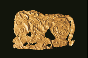 【虎噬羊紋金飾片·戰(zhàn)國(guó)·清水縣劉坪出土】工藝技法采用常見的錘碟法,在薄的金片的背面鏨刻虎形,正面隆起,邊緣剪切,四角有釘孔?;⒊识拙嵝危?、鼻、耳、嘴、齒、爪都十分清晰,虎張嘴,伸溝狀前爪抓住一羊。