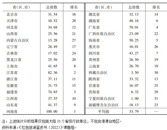 近日,北京第二外國語學(xué)院旅游科學(xué)學(xué)院與社會科學(xué)文獻(xiàn)出版社共同發(fā)布了紅色旅游藍(lán)皮書《中國紅色旅游發(fā)展報(bào)告(2022)》(以下簡稱《藍(lán)皮書》)。《藍(lán)皮書》指出,中國紅色旅游發(fā)展水平持續(xù)提升,31個省級行政單位(不含港澳臺地區(qū))的紅色旅游發(fā)展指數(shù)排名中,位列前十的依次為河南省、江蘇省、福建省、廣東省、海南省、湖南省、四川省、上海市、山東省、江西省。