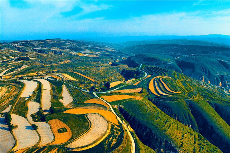 固原梯田分布于寧夏南部六盤山區(qū),始于上世紀(jì)60年代,是當(dāng)?shù)厝罕妶?jiān)持戰(zhàn)天斗地“坡改梯”、既種莊稼又種風(fēng)景,“一任接著一任干,一張藍(lán)圖繪到底”,精心打造的一項(xiàng)規(guī)模宏大的綠色生態(tài)工程。美輪美奐的梯田鑲嵌在黃土高原上的每一處褶皺上,條條田壟如鏈似帶,從山腳盤旋至山頂,層層疊疊,高低錯(cuò)落,形成春賞山花、夏觀梯田、秋品紅葉、冬覽水墨的四季畫卷,被譽(yù)為最美的大地“指紋”“中國(guó)最美旱作梯田”,入選“中國(guó)美麗田園”10項(xiàng)梯田景觀之一。寧夏梯田看固原,固原梯田看彭陽(yáng)。彭陽(yáng)梯田既是黃土高原上梯田的縮影,也是黃土高原生態(tài)治理的典范。近年來(lái),打造的金雞坪梯田公園、嘛喇灣梯田公園、青云灣梯田公園三大核心“五彩梯田”公園,每年4月“山花旅游節(jié)”游人如織,在“77號(hào)彩虹路”加持下,成為新晉網(wǎng)紅打卡地。
