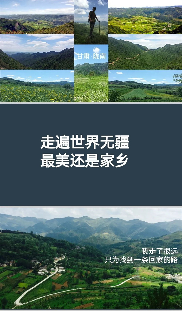 我每次回到西北各省區(qū)參加活動(dòng),做演講分享時(shí),總會(huì)放幾頁(yè)P(yáng)PT介紹我的家鄉(xiāng)——大隴南,配圖都是我拍攝的我們村莊附近的風(fēng)光,也經(jīng)常說(shuō)一句話——“走遍世界無(wú)疆,最美還是家鄉(xiāng)”,不辭長(zhǎng)作隴南人。