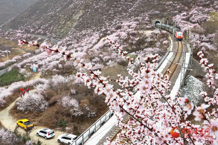 陽(yáng)春三月,桃之夭夭。在崇信縣的漫山遍野上,朵朵桃花迎來盛放期。微風(fēng)吹來,暗香浮動(dòng)。近看,朵朵嬌俏的桃花層層疊疊,錯(cuò)落有致。遠(yuǎn)看,漫山紅遍如霞似錦,爛漫壯觀。特別是一列列火車穿行而過,與桃花撞了個(gè)滿懷,奔向充滿希望的春天。
