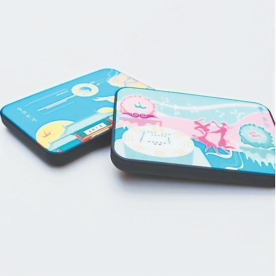 圖案來源于伏羲女媧因分別從山頂推下的兩磨盤緊緊結(jié)合的現(xiàn)象驗(yàn)證了上蒼意圖,決定繁衍后代的傳說?;瘌B騰飛之日與玉兔奔騰之月隔著天河星辰分懸兩邊,繪有河圖的磨盤見證生命的起源,雙人自由舞動(dòng)的身軀揚(yáng)起歡騰的節(jié)律,完美契合于陰陽諧振的樂音。美好寓意的組合充溢起整個(gè)載體,令人傾心又矚目于彩色流韻的真景里。