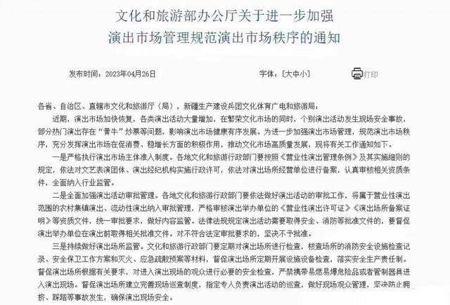 四是重點加強大型演出活動現(xiàn)場監(jiān)管。對臨時搭建舞臺、看臺的演唱會、音樂節(jié)等大型演出活動,文化和旅游行政部門要做好演出現(xiàn)場監(jiān)管,查驗演出舉辦單位的演出批準文件及相關手續(xù),核驗演員信息及演出節(jié)目內容,嚴禁擅自變更演員及演出內容,嚴禁假唱、假演奏等違法違規(guī)行為。要配合公安部門做好現(xiàn)場安全管理,堅決防范演出安全事故發(fā)生。