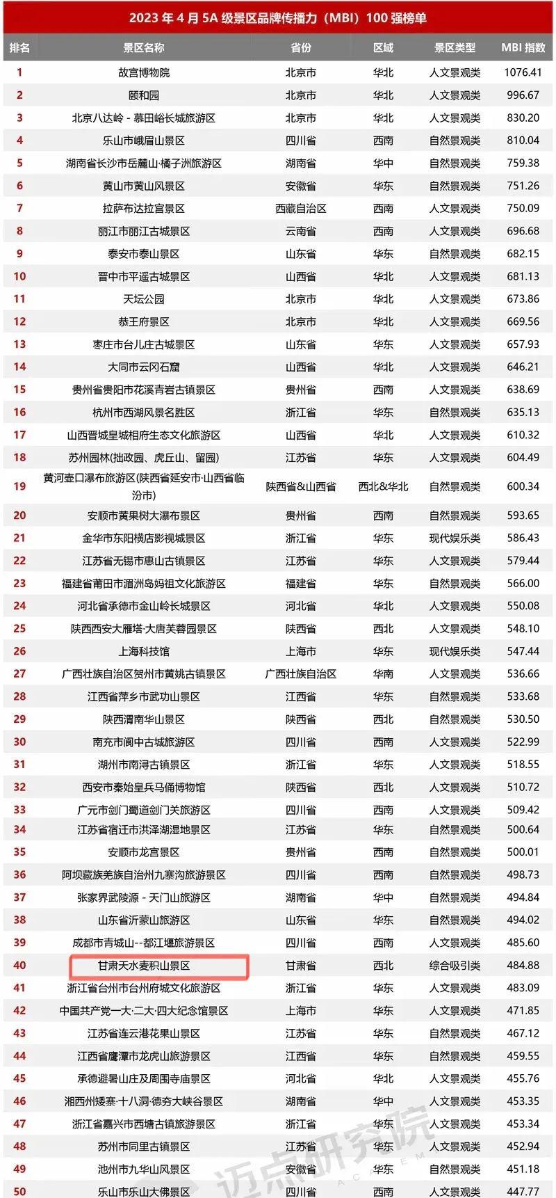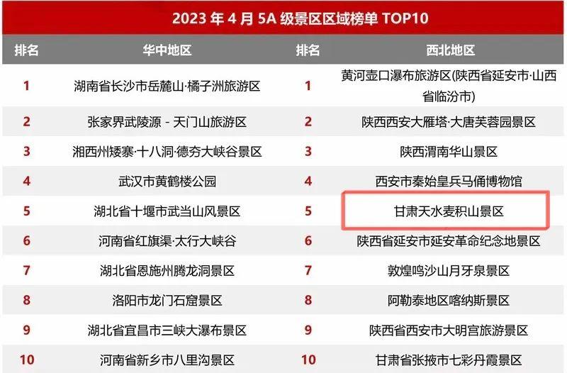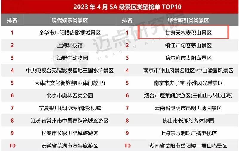 2023年4月5A級(jí)景區(qū)品牌傳播力100強(qiáng)榜單上,熱烈祝賀麥積山景區(qū)榮登國內(nèi)文旅行業(yè)最具影響力的權(quán)威數(shù)據(jù)分析機(jī)構(gòu)“邁點(diǎn)研究院”4月5A級(jí)旅游景區(qū)品牌傳播力百強(qiáng)榜單前五十和綜合類旅游景區(qū)第一、西北地區(qū)分項(xiàng)榜單第五。