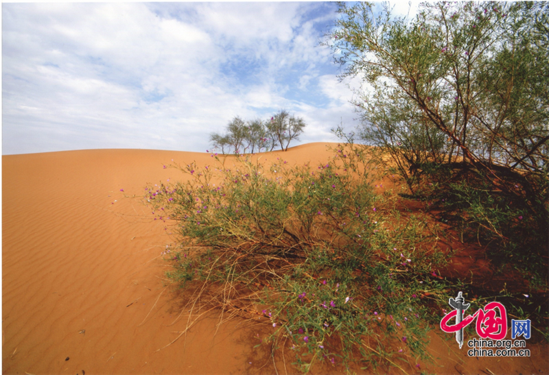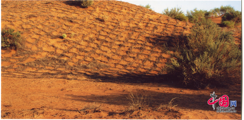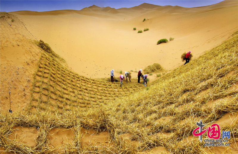 小小的“麥草方格”不僅阻止了流沙,防止了荒漠化,還加速了當(dāng)?shù)亟?jīng)濟的發(fā)展。“麥草方格”固沙法即:將廢棄的麥草呈方格狀鋪在沙面上,然后用鐵鍬軋進沙中,留麥草的三分之一或一半立在四周,并在方格中植入治沙人經(jīng)九次試驗成功培育出的花棒、檸條等沙生植物,腐爛干枯的麥草還作為肥料滋養(yǎng)植物的生長。