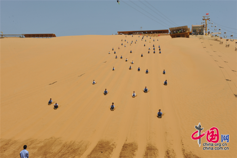 位于沙坡頭旅游區(qū)的中國國際滑沙中心,是西北地區(qū)最大的天然滑沙場,隆起100多米高的沙坡,筆陡如削,每到天晴沙漠曬熱時,人從沙坡滑下,會發(fā)出“嗡嗡”之聲,恍若鳴鐘,故有“沙坡鳴鐘”這一傳世勝景之名。