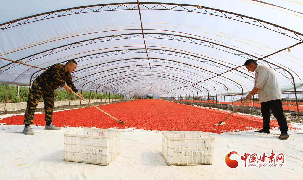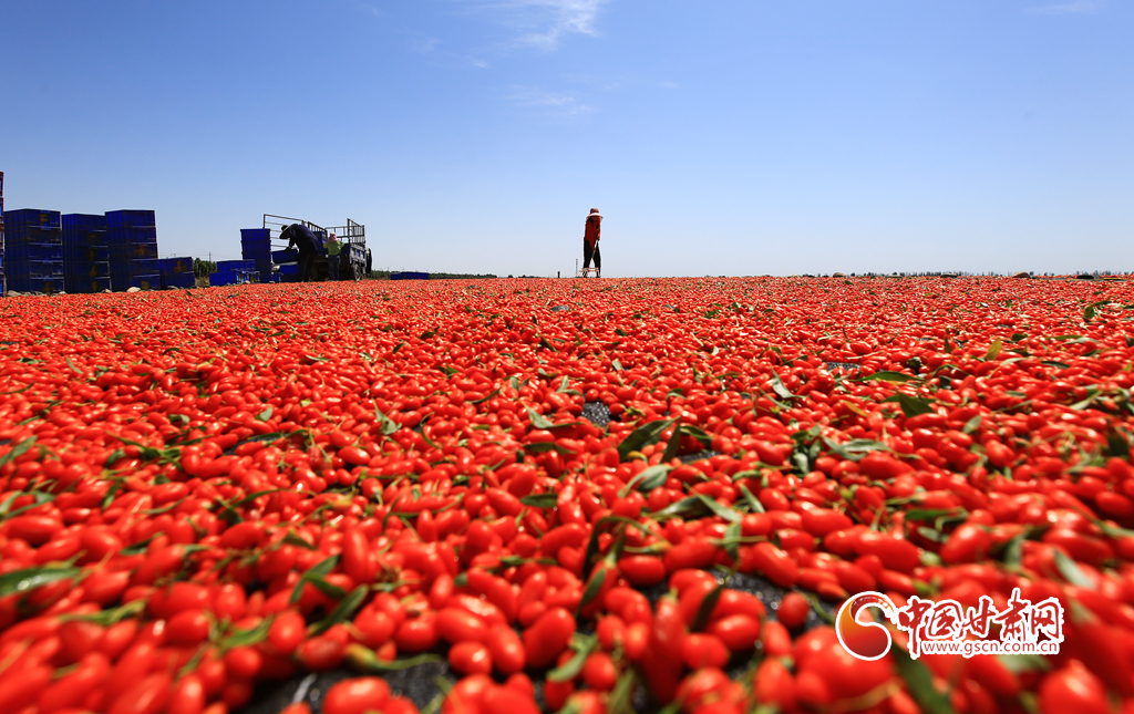 近日,嘉峪關(guān)市新城鎮(zhèn)一公司的1.89萬畝頭茬枸杞迎來采收季,枸杞種植戶搶抓晴好天氣采摘、拉運(yùn)、晾曬枸杞,枸杞園內(nèi)外一派繁忙的豐收景象。