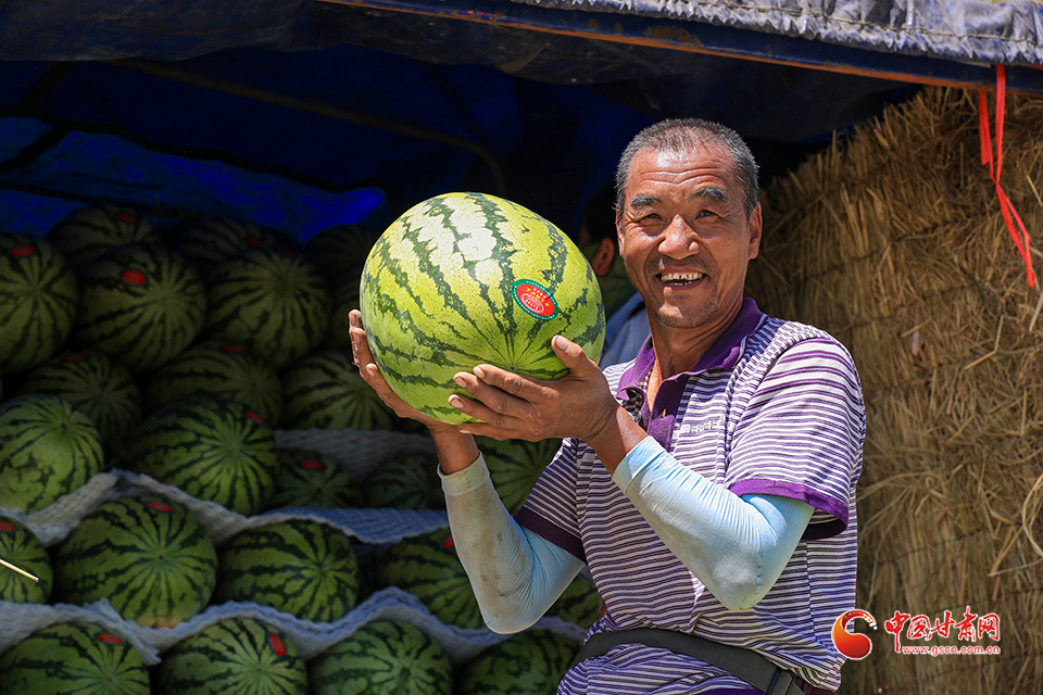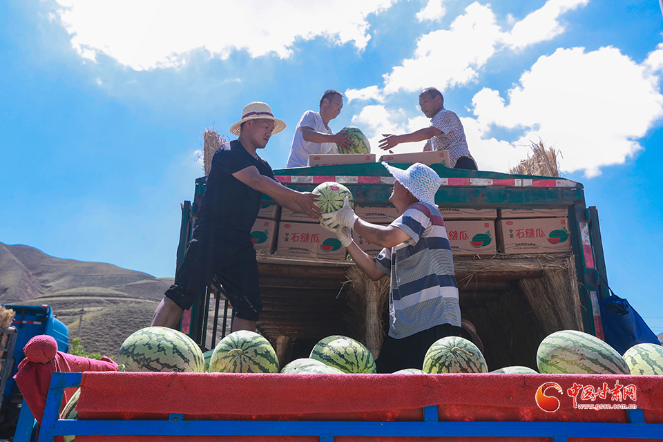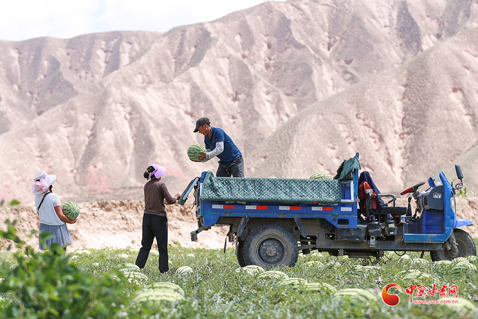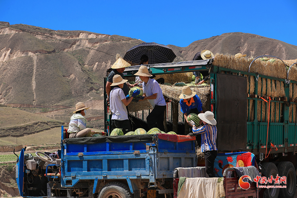 7月31日,甘肅省白銀市會(huì)寧縣土高山鄉(xiāng)種植的砂田西瓜喜獲豐收,瓜農(nóng)們忙著采收、搬運(yùn)、裝車外運(yùn),“搶鮮”上市銷售。