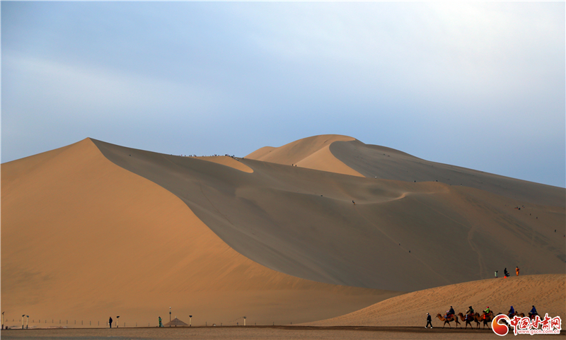 鳴沙山以沙動成響而得名,峰巒危峭,山脊如刃。最早在東漢辛氏《三秦記》中有“河西有沙角山,峰崿危峻,逾于石山,其沙粒粗色黃,有如乾糒……人欲登峰,必步下入穴,即有鼓角之聲,震動人足”的記載。而月牙泉是環(huán)抱在鳴沙山中的一灣清泉,形如玄月,故名“月牙泉”,并形成了鳴沙山月牙泉景區(qū),被譽為“塞外風光之一絕”。