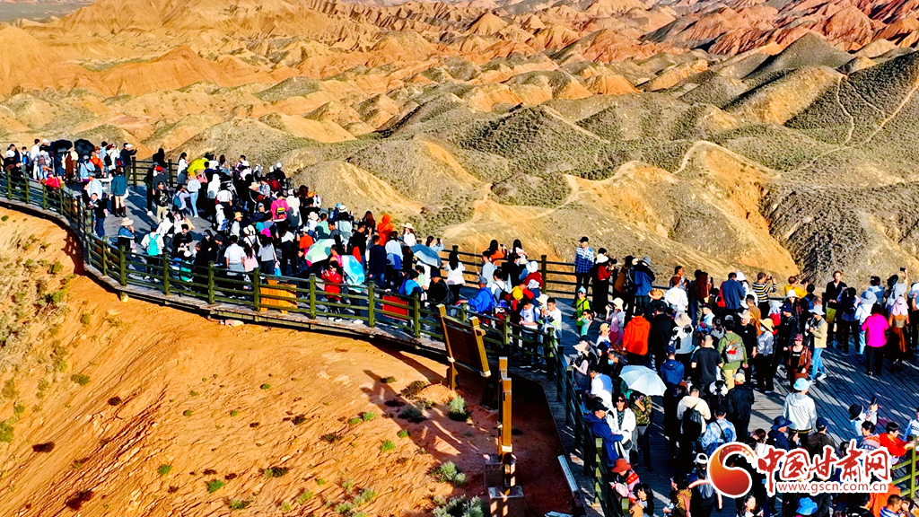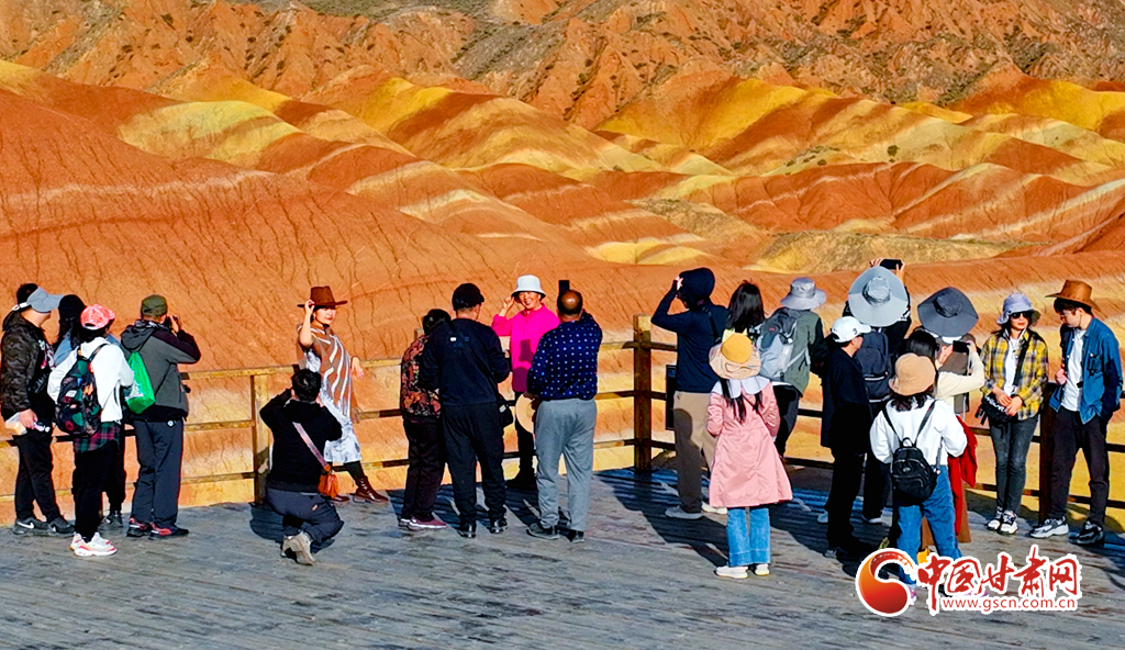 張掖七彩丹霞地貌群以其層理交錯、巖壁陡峭、氣勢磅礴、造型奇特、色彩斑斕而稱奇。2020年,國家文化和旅游部確定張掖七彩丹霞景區(qū)為國家5A級旅游景區(qū);同年,張掖地質(zhì)公園獲批“聯(lián)合國教科文組織世界地質(zhì)公園”。據(jù)七彩丹霞景區(qū)管委會統(tǒng)計,當(dāng)日是中秋國慶假期第二天,該景區(qū)游客量達(dá)29000多人?!?/p>
