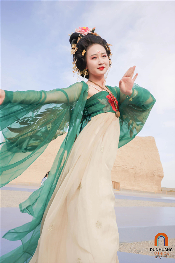 張紀表示,在敦煌展演華服本身就是一種藝術滋養(yǎng),特別是在衣服細節(jié)之處,她們更是精益求精。比如盤扣的手工技藝,扣子使用玉石等,都讓每件華服不僅講述絲綢之路故事,更有玉帛之路的厚重,這一切在玉門關展演又剛剛好。
