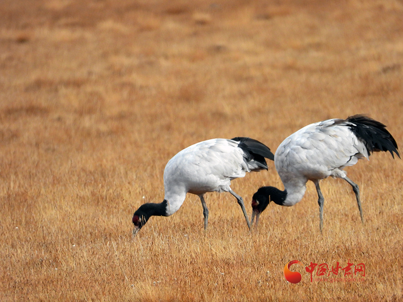中國甘肅網(wǎng)10月17日訊 (西北角·中國甘肅網(wǎng)記者 張慧雅)近日,甘肅祁連山國家級自然保護區(qū)工作人員在轄區(qū)巡護時偶遇國家一級保護野生動物黑頸鶴歇息覓食的場景,兩只黑頸鶴漫步在一處濕地中一邊欣賞美景一邊享用美食。
