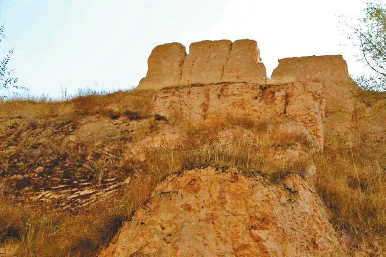 在威戎鎮(zhèn)見到的第一處遺存,是位于威戎鎮(zhèn)廣場后的一處臺地。這一處遺存,是一段殘破的老城墻,以及一座形似堡樓的殘垣。站在臺地之下,仰望斷墻,人工修筑的痕跡十分明顯,層層黃土夯筑,因為廢棄殘破而長滿了荒草。走近堡樓,可以看見當(dāng)時修筑時搭建木椽的孔洞,還有很多手掌大小的圓形石塊。