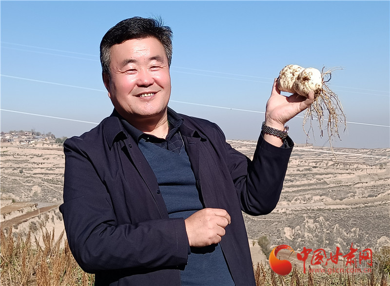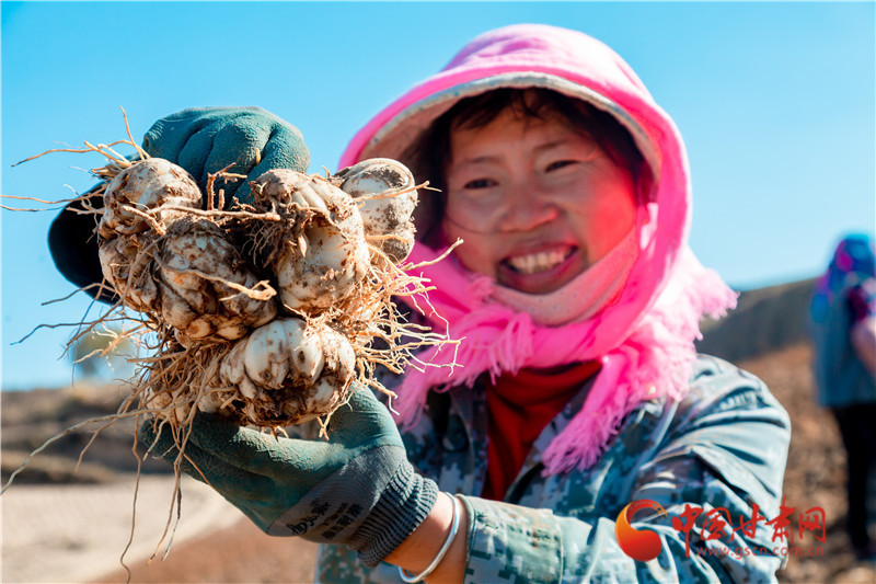 同樣在榆中縣園子岔鄉(xiāng),連片的田間地頭里,農(nóng)民們干勁十足,臉上洋溢著豐收的喜悅。隨著鋤頭的翻挖,一顆顆個大飽滿的百合破土而出,構成了一幅繁忙的秋收畫卷。