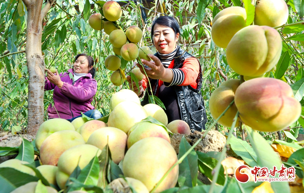 11月13日,甘肅省張掖市甘州區(qū)長(zhǎng)安鎮(zhèn)一果蔬種植專業(yè)合作社“甘泉雪桃”種植基地大棚內(nèi),種植農(nóng)戶正在采摘成熟的“甘泉雪桃”。